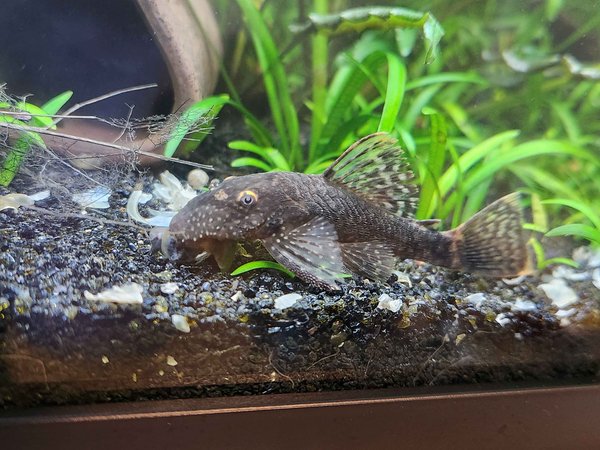 One of two calico bristlenose plecos I originally bought from Mandy during March's mega swap! Note that this fish presents as mostly black. Approximately 3" in length, sex unknown.