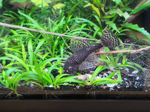 One of two calico bristlenose plecos I originally bought from Mandy during March's mega swap! Note that this fish presents as mostly black. Approximately 3" in length, sex unknown but tiny bristles are starting to come in.