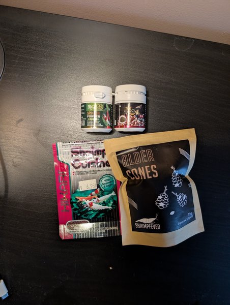 Contains shrimp food, baby shrimp powder, spinach powder, and alder cones. Treat yo shrimp!