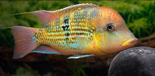 Characterized by shimmering golden bodies, red-humped males, and blue iridescence. Reaching 6–8 inches, they require sand substrate for sifting, prefer 72–82°F, 5.5-7.5 pH and are generally peaceful omnivores, maternal mouthbrooders.