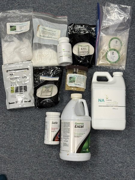 Shutting down my tanks and all chemicals must go. Includes Seachem safe 250 g flourish excel about half of a 2 L bottle., Thrive all in one fertilizer approximately 2 L plantex CSM plus B, thrive capsules 30+ capsules, selected, salts pH booster,, NA DIY FERTILIZER MIX, MAGNESIUM SULFATE, POTASSIUM, PHOSPHATE, POTASSIUM, NITRATE, AND Gh booster