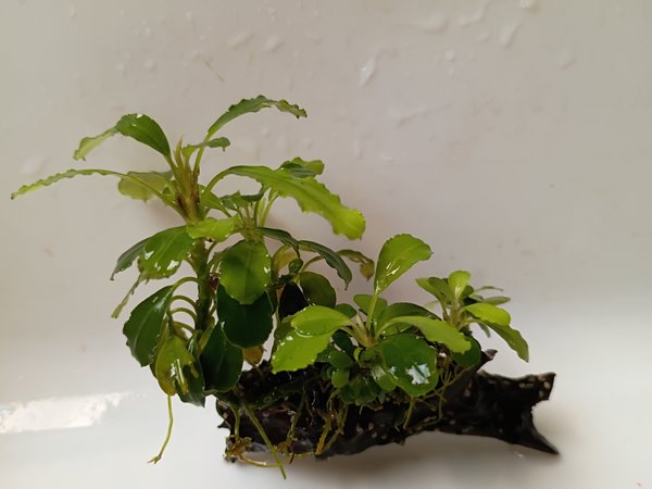 Lovely rare bucephlandra on small driftwood, exact variety unknown (Belived to be "Green Wavy"). Mature plant, spreading with multiple rhizomes. Eggs seen on Driftwood are nerite and will not hatch, however there is a possibility of other snail eggs. Grown submersed.