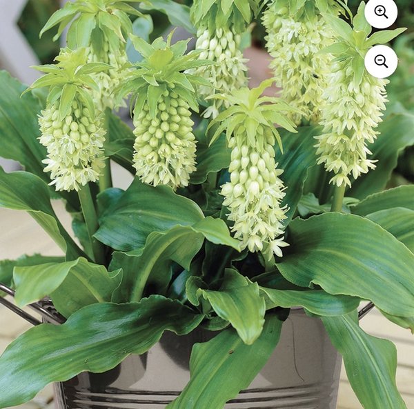 Eucomis sp. Tender bulb that needs to be dug up after first frost if planted outside. Or leave in the pot and store in the basement after the leaves die. Nice tropical foliage. Looks nice next to a pond.