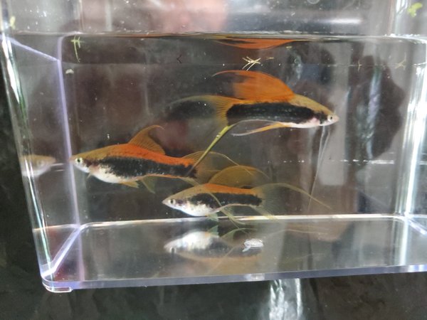 Trio Hi Fin Lyretail Neon Tuxedo Swordtails. 1 male, 2 pre hit females
