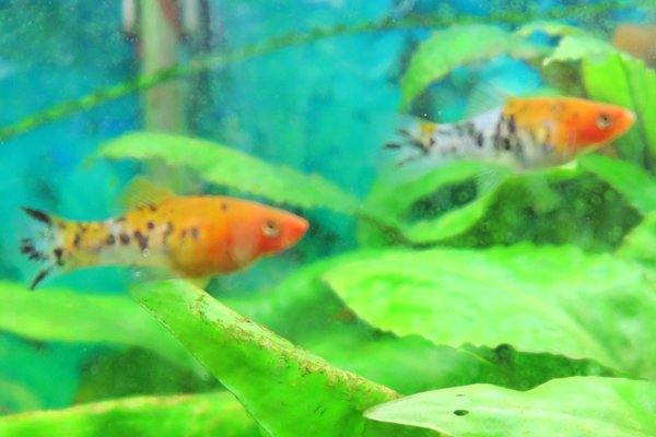 Koi Sanke Swordtails (Xiphophorus helleri) - A very colorful swordtail variation featuring orange, black, and white/silver koi-like coloration - 3 fish (1 male, 2 females)