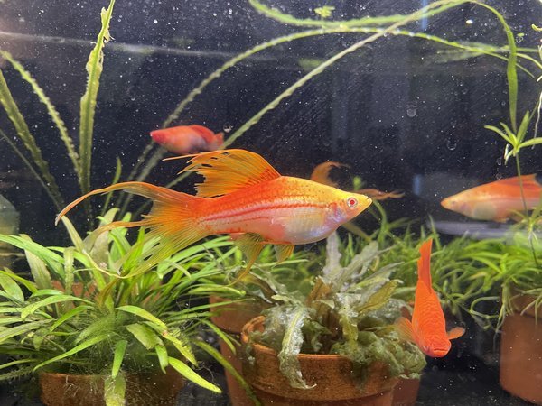 9 fish, including at least one lyretail female and one non-lyretail male needed to breed, to the best of my ability to sex them. Photo is likely the photo of the mother.