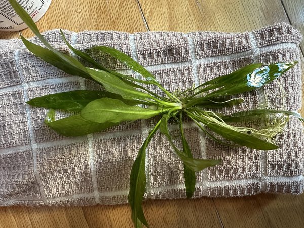 1 medium size plant. Strain of the classic amazon sword that stays a more managable size. Grows numerous lance shaped leaves. Propagates like a spider plant, by forming plantlets on a stalk.
