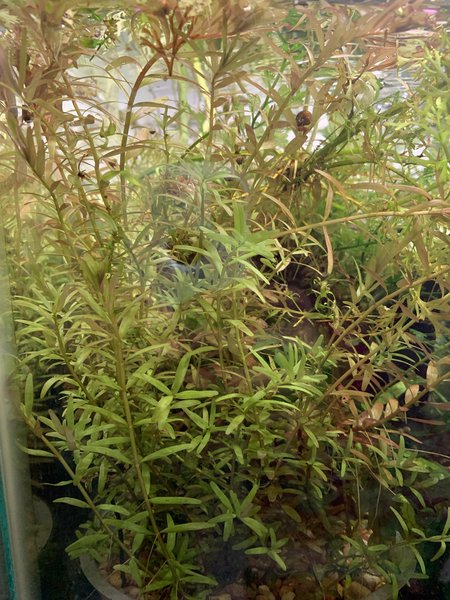 Stem plant with small red and green leaves. Doesn't need fancy lights to thrive, but still provides a nice splash of color.