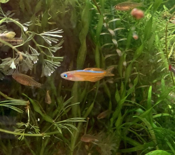 Pseudomogil luminatus. Stunning dwarf rainbowfish from the Pseudomogil genus. This fish is a mop spawner and will deposit a few eggs daily. Does well in warmer conditions around 75-80F. Males perform lively spawning dances showing off their exquisite finnage. Check out Daku Aquatics online for content on keeping this fish.