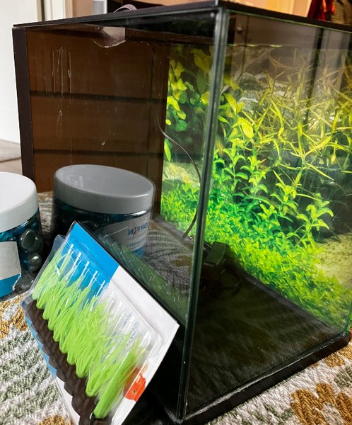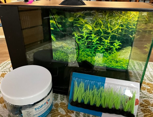 All-in-one all glass tank with built in filtration and lighting system. Includes small pump and top. The light is adjustable to various colors. 13” wide, 9” tall, 6.5” deep, so approximately 3.3 gal. Perfect for nanofish or shrimp. Originally sold by Top-Fin for $59.99. The link refers to a 2.5 Gal tank, but all the features appear similar. Minimum price set at $10. Includes chunky aquarium décor.
