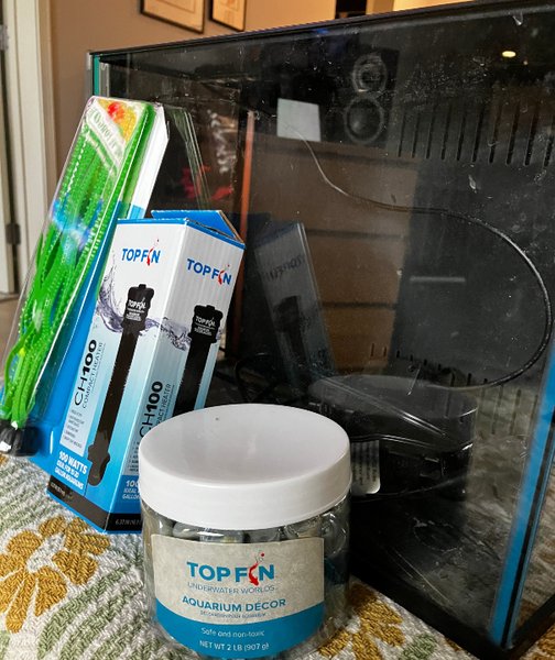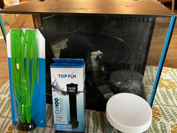 All-in-one all glass tank with built in filtration and lighting system. Includes small pump and top. The light is adjustable to various colors. 16” wide, 11” tall, 8.5” deep, so approximately 6.5 gal. Perfect for a betta or nanofish. Originally sold by Top-Fin for $79.99. The link refers to a 2.5 Gal tank, but all the features appear similar. Minimum price set at $15. Includes chunky aquarium décor and 100W submersible heater preset to 78F.