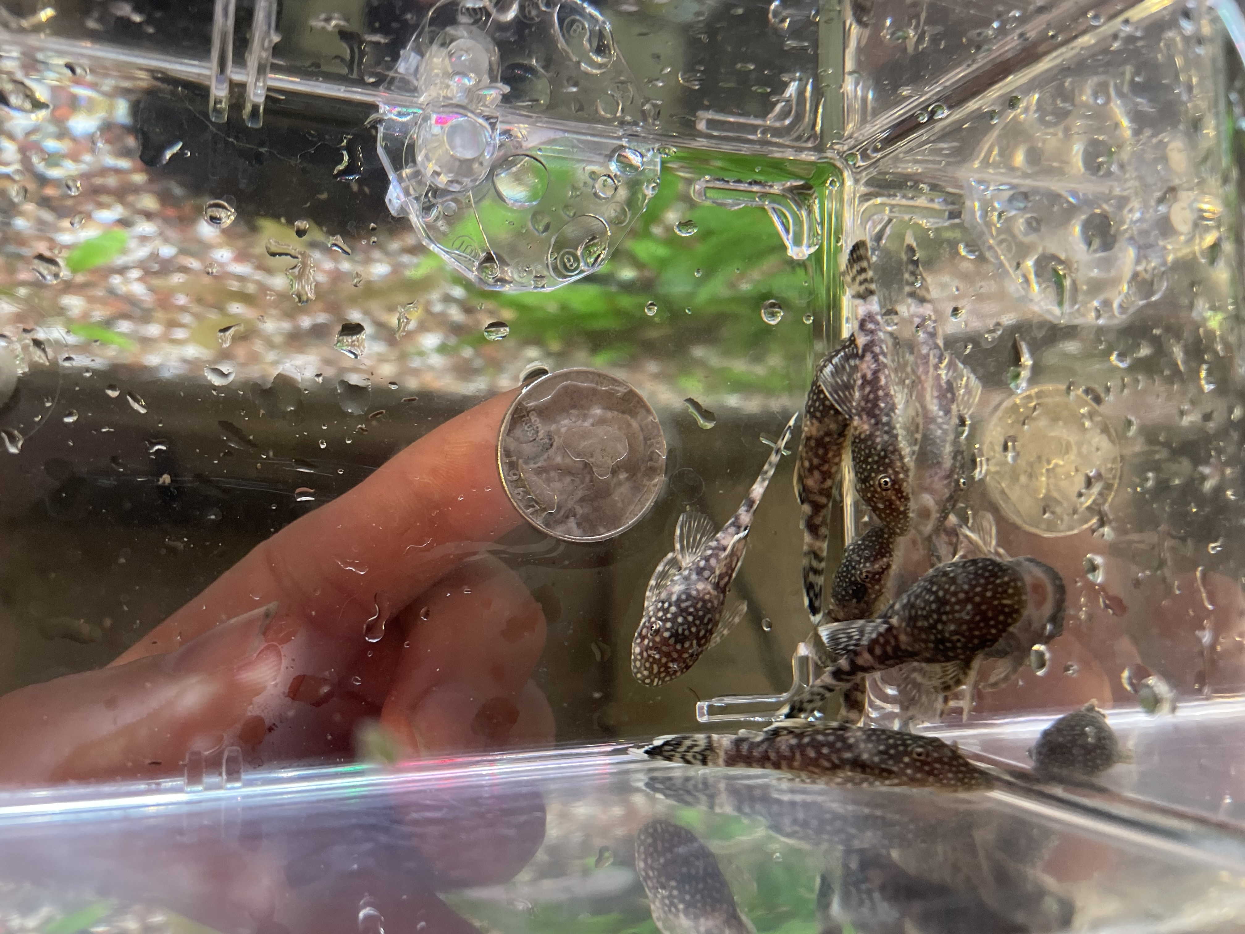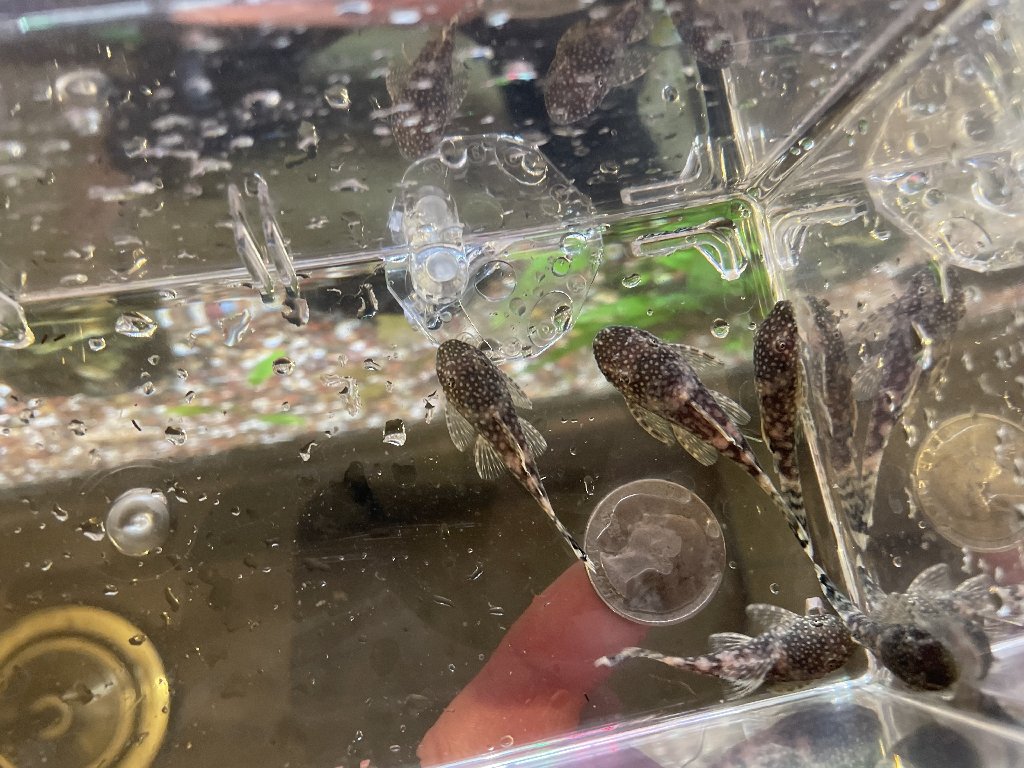 8 Bushynose Pleco Fry. I held a quarter up in some of the pictures for scale on the size.