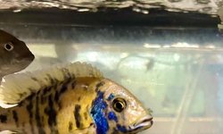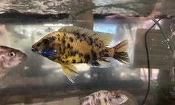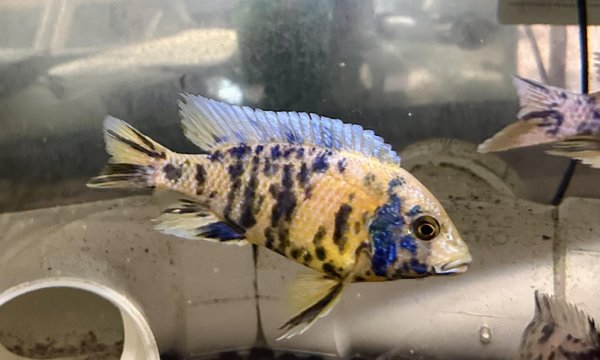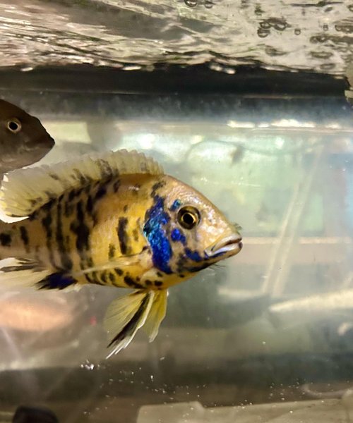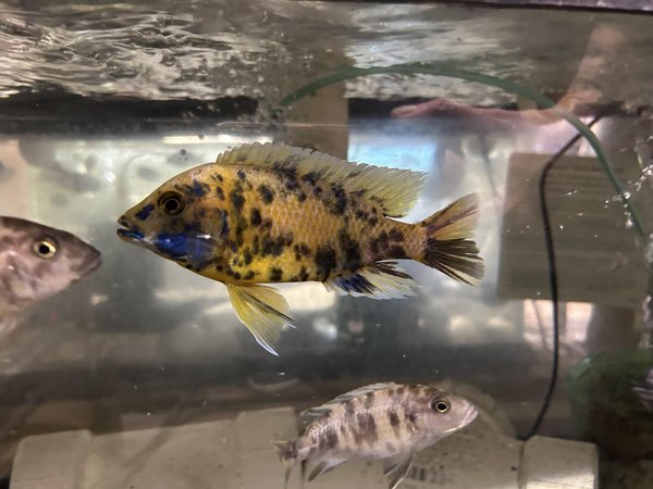Amazing yellow and blue color pattern on the male. Actively breeding pair ( 1 male 1 female) of large adult OB Sunshine Peacocks. Very prolific and probably 5”+