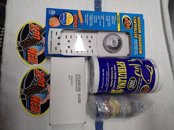 Aquasun aquarium controller, 4 oz container of Spirulina flakes, one bottle of water conditioner, stickers & fish ornament