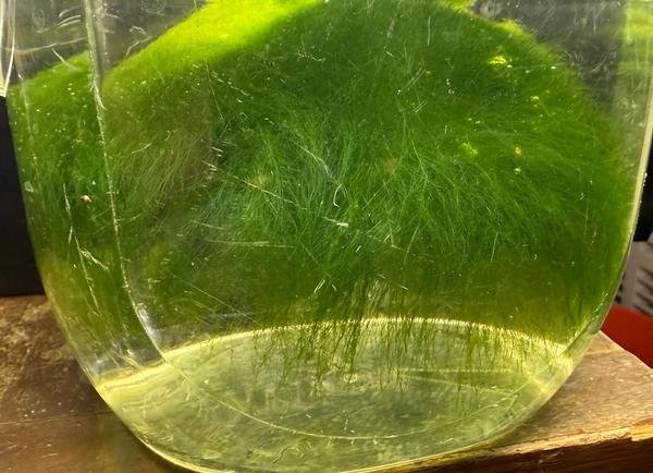 Hair Algae with its single cell thickness, is one of the best denitrifying strategies you can implement. It acts like a Nitrate sponge helping detoxify the water for your many critters. Most hair algae also comes with many negative "side effects". This cultivar does not. This hair algae is cohesive not adhesive. Its cells only "stick" to another algal cell.... not to the glass, filters or plants like many other hair algae strains. Another advantage is that it floats. This cultivar can form a thick floating mat on the surface of the water. That "mat" in turn becomes a literal nitrate sponge. As you can see in the photo, many algal filaments are pendent, hanging down offering great hiding places for fish fry and immature shrimp. It is much easier to "weed out" than other "plants". Most of it floats so it's easy to reach in and tear off a chuck of the floating mat. If cells revert to the sinking habit, they still colonize into little green hair algae "balls". Easily removed because the cells stick to themselves ... not to the glass or filters. Looks good, offers hiding places for fry, absorbs nitrates and doesn't take over the tank.... win, win, win, win!
