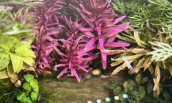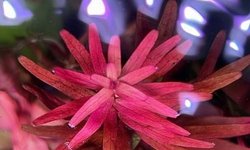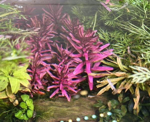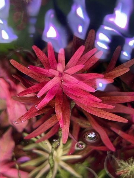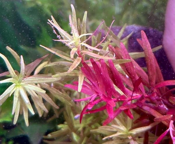 "Blood Red Singapore" variety. In my experience, this is the reddest of the rotala rotundifolias. The second image is this plant in a no co2, no filter tank. It says fairly red even without co2. (first image is co2 injected tank). (redder than H'ra, and slightly bigger leaves)