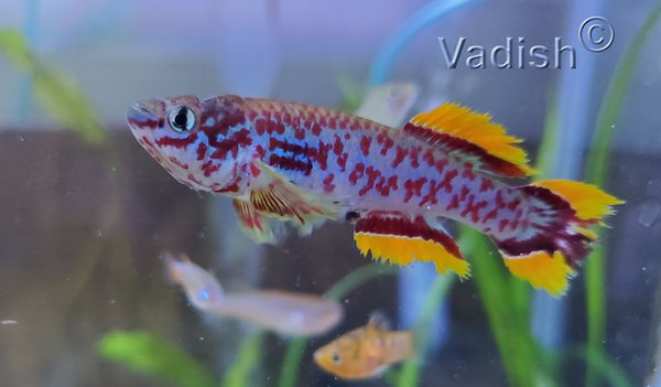 Fp. gardneri Makurdi Long Fin native to Cameroon and Nigeria. It will eat live or frozen bloodworm, brine shrimp, daphnia, and also will accept dry food. It can grow up to 2.7 in (7 cm). The water temperature in the tank should be 72-82°F (22-28°C) and water pH should be 6.0 – 8.2. This is a peaceful fish and could be good for community tank, however males will chase each other as for many other fish.