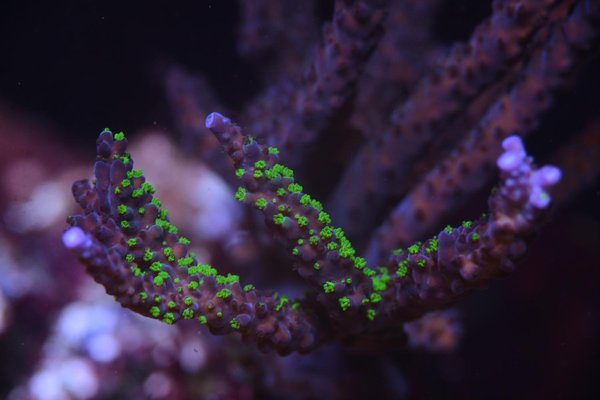 I got this as a boring purple stag from someone getting out of the hobby. After a couple years, one branch developed green polyps, making this absolutely pop. There's absolutely nothing like this out there from any vendor or hobbyist as far as I know.