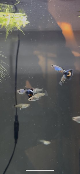 (Male + Female) pair of home-bred guppies from Singapore Blue × King Cobra lines. These fish feature a bluish-silver body with small orange patches and colorful, blue-patterned tails, showing a beautiful mix of both parent strains.