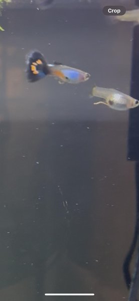 (Male + Female) pair of home-bred guppies from Singapore Blue × King Cobra lines. These fish feature a bluish-silver body with small orange patches and colorful, blue-patterned tails, showing a beautiful mix of both parent strains.