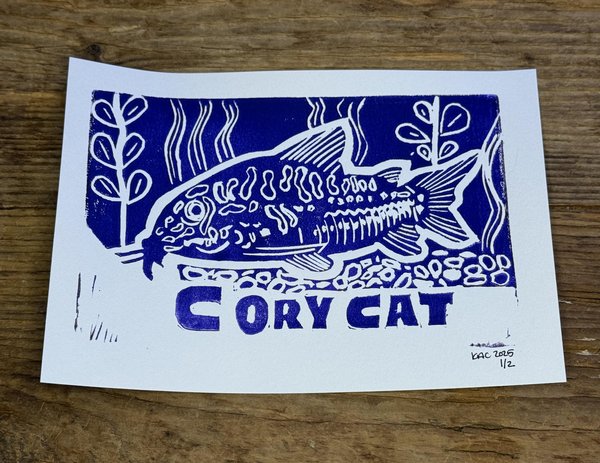 Block print of a Corydoras catfish in violet/purple ink. The block used to make the print was hand carved by me! The print is on 5” x 7’ paper and the print area is approximately 4” x 6”. Number 1 of 2 available.