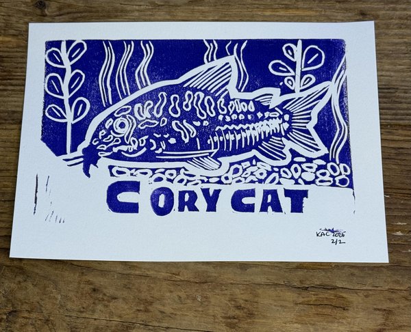 Block print of a Corydoras catfish in violet/purple ink. The block used to make the print was hand carved by me! The print is on 5” x 7’ paper and the print area is approximately 4” x 6”. Number 2 of 2 available.
