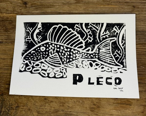 Block print of a Pleco in black ink. The block used to make the print was hand carved by me! The print is on 5” x 7’ paper and the print area is approximately 4” x 6”. Number 1 of 2 available.