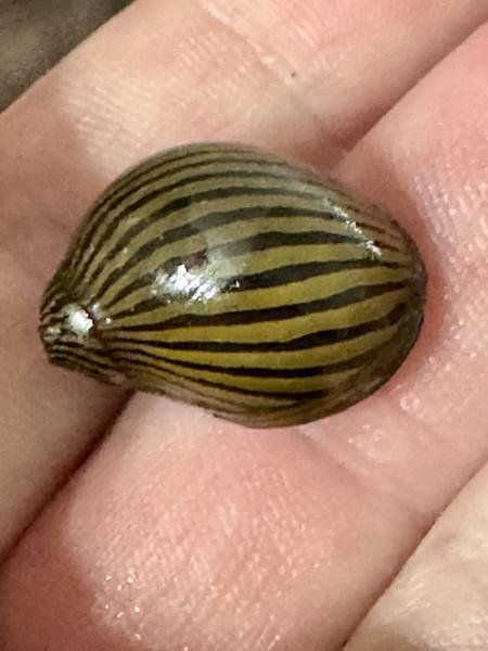 Zebra Nerite snail: algae-eating, peaceful, striking black-and-gold striped shell; great for clean tanks.