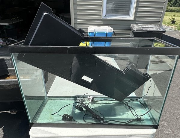 29 gallon aquarium with two led lids and a heater. Tank has cracked top frame but holds water.