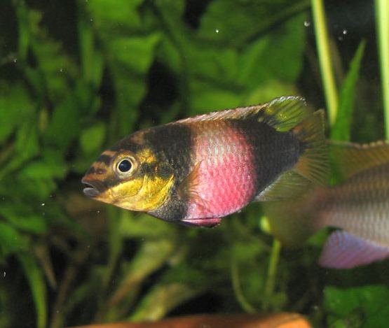 Pelvicachromis subocellatus, a charming dwarf cichlid from West Africa, is a wonderful choice for aquarists seeking a colorful and peaceful species with interesting behaviors. These fish are relatively small, reaching a maximum size of around 3 inches (7.5 cm), with females often being slightly smaller but more vibrantly colored—especially during courtship, when their bellies glow with rich shades of pink or purple, contrasting beautifully with their yellowish-gold flanks and dark markings. They thrive in well-structured aquariums with plenty of hiding spots, such as caves, driftwood, and dense planting. Ideal water conditions include a temperature of 75–80°F (24–27°C), a pH between 6.0 and 7.5, and soft to moderately hard water (4–12 dGH). These cichlids are generally peaceful and do well in a calm community tank, particularly with other non-aggressive species. During breeding, a bonded pair will select a cave or sheltered area for spawning, with the female guarding the eggs and fry while the male defends the territory. Their engaging parenting behavior and attractive appearance, especially that of the vividly colored females, make Pelvicachromis subocellatus a rewarding and visually striking addition to a peaceful freshwater setup.